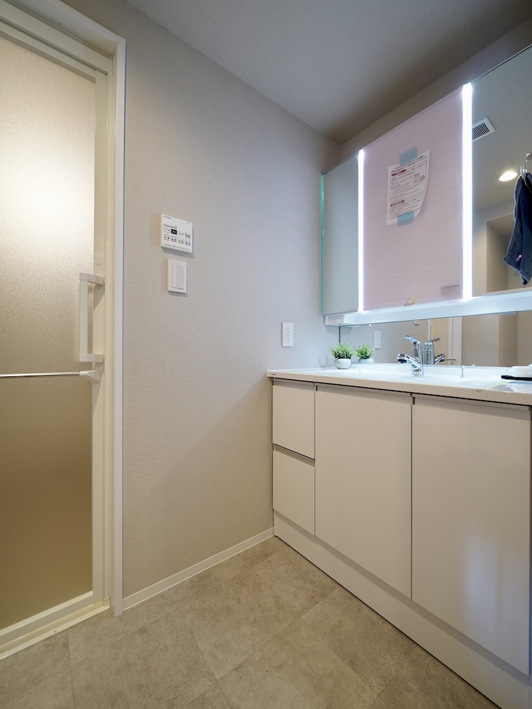 すべりにくく乾きやすい床や節水効果のあるシャワーヘッドのほか、浴室乾燥機や追い焚き機能も備わっています。
