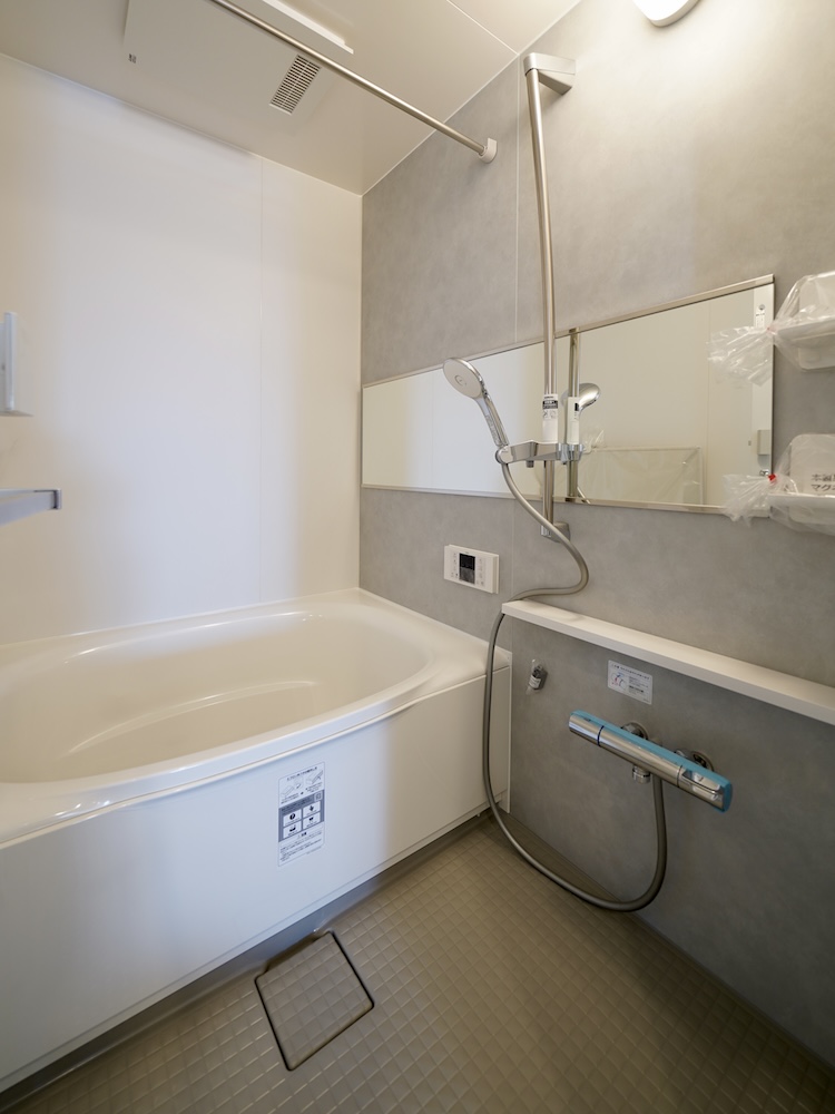グレースタッコ調のパネルが落ち着いた雰囲気のバスルーム。