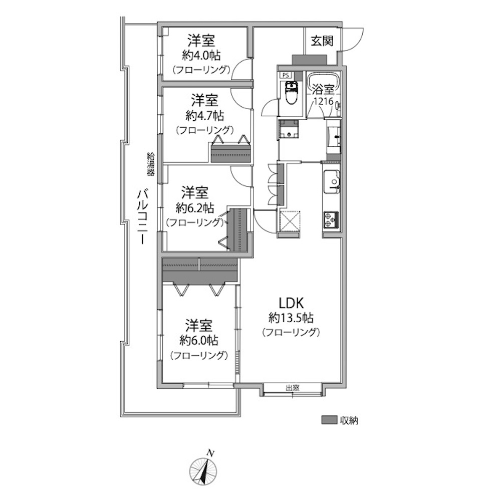 廊下には、6.2畳、4.7畳、4畳の、三つの個室を配置。