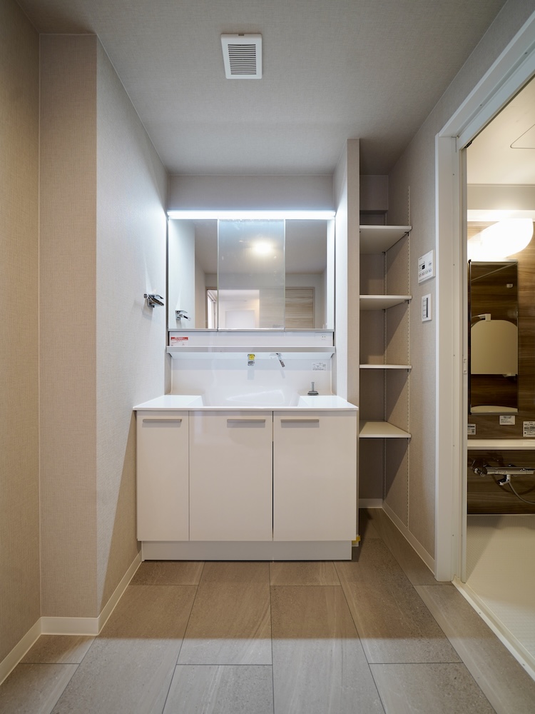 幅広洗面台の大きなキャビネットに加え、天井まで高さのある、大きなリネン庫が設計されています。