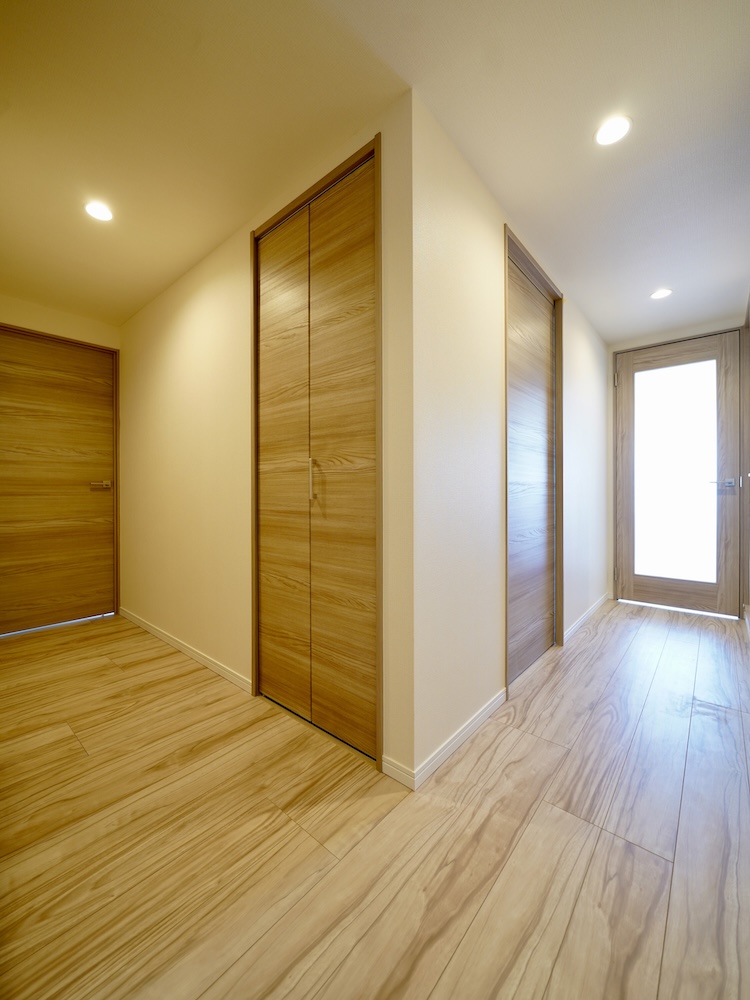 正面に設けられた廊下収納は、帽子や傘など、外出前に取り出したいアイテムを入れるのに便利です。