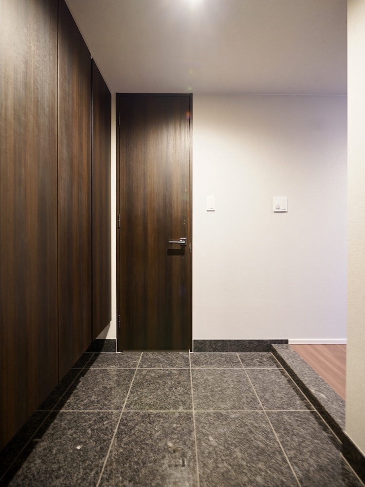 玄関を入ると、ダークブラウンの色合いが美しい、落ち着きあるインテリアが広がります。