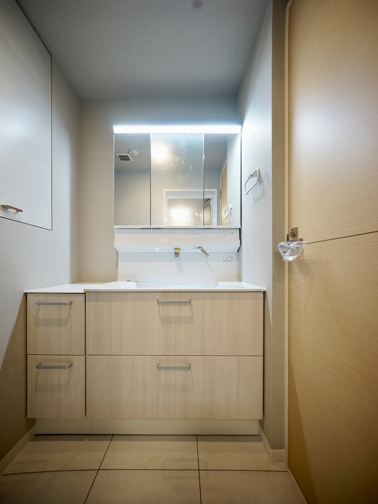 洗面台は、引き出し型キャビネットにサイドキャビネットを加えた収納充実仕様で、さらに壁面にはニッチ収納を用意。