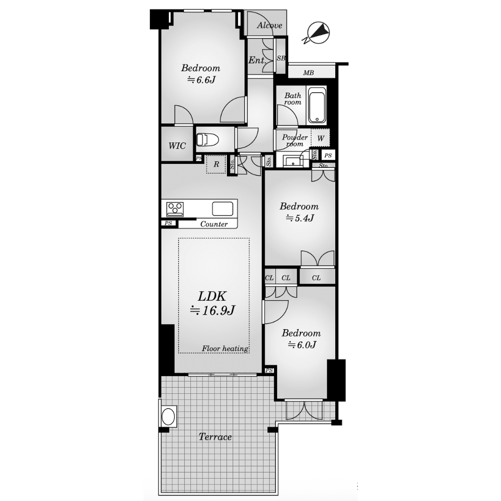 広い専用テラスが付いた、約75平米のゆとりある間取り。ベージュトーンの美しいインテリアに、食洗機や床暖房など最新設備が備わります。