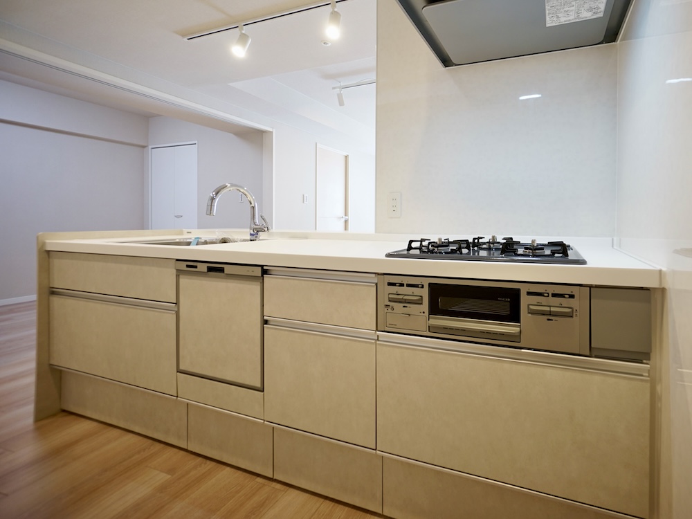 ベージュとホワイトのやわらかい色合いがインテリアに溶け込みつつ、取手のメタルラインやグースネック水栓が上質な印象を加えます。