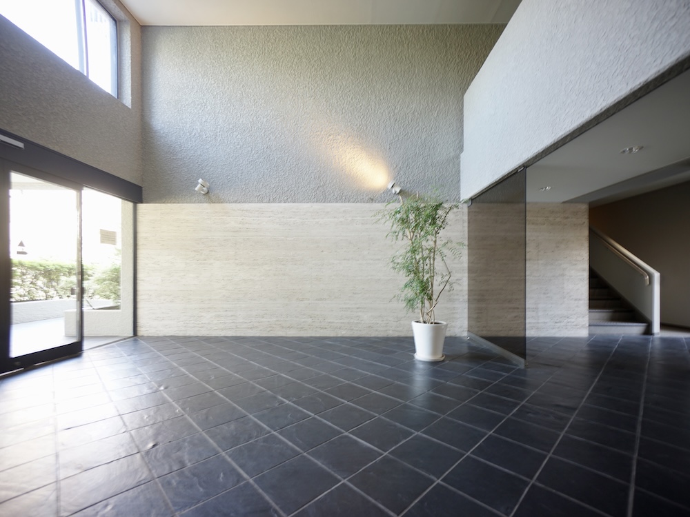 スポットライトが壁面に陰影をつくり、観葉植物がオブジェのように佇み、凛とした雰囲気を醸しています。