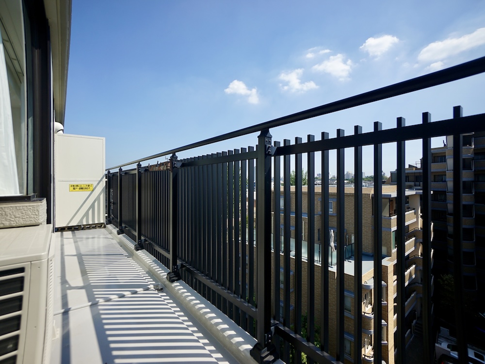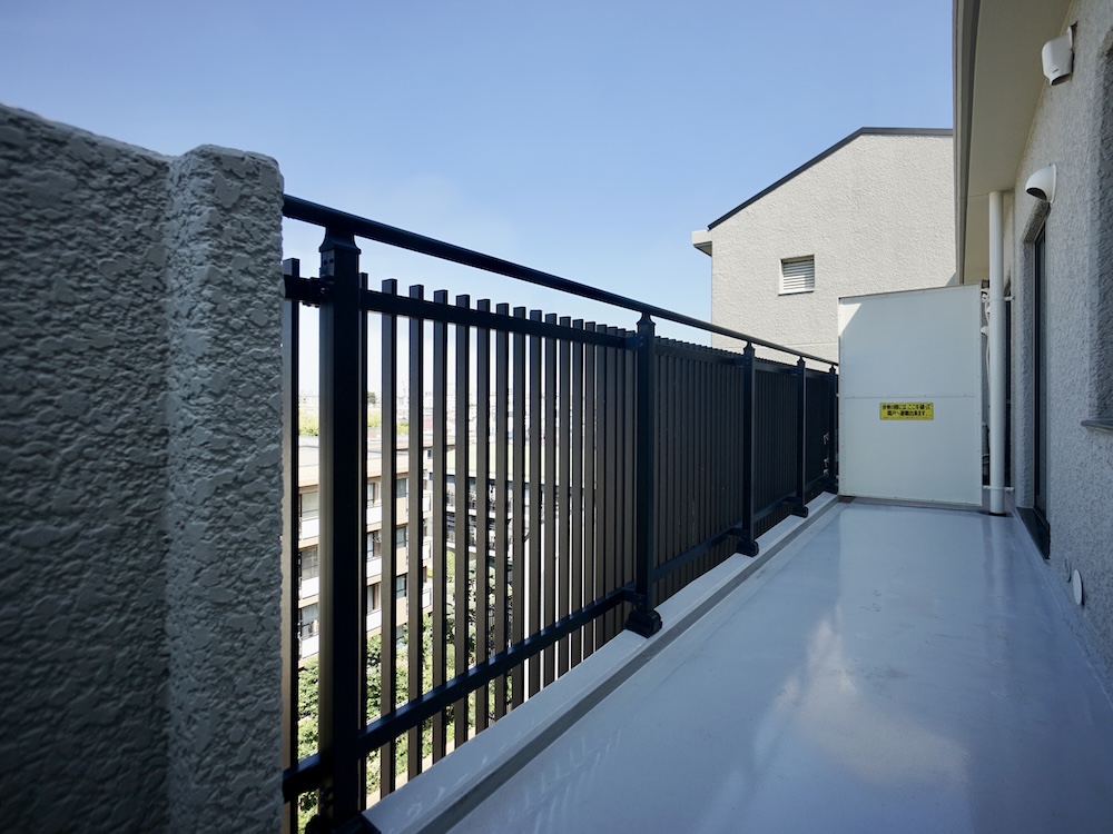 南面全体を覆うバルコニーは、格子手すりを光と風が抜ける、心地の良い場所。