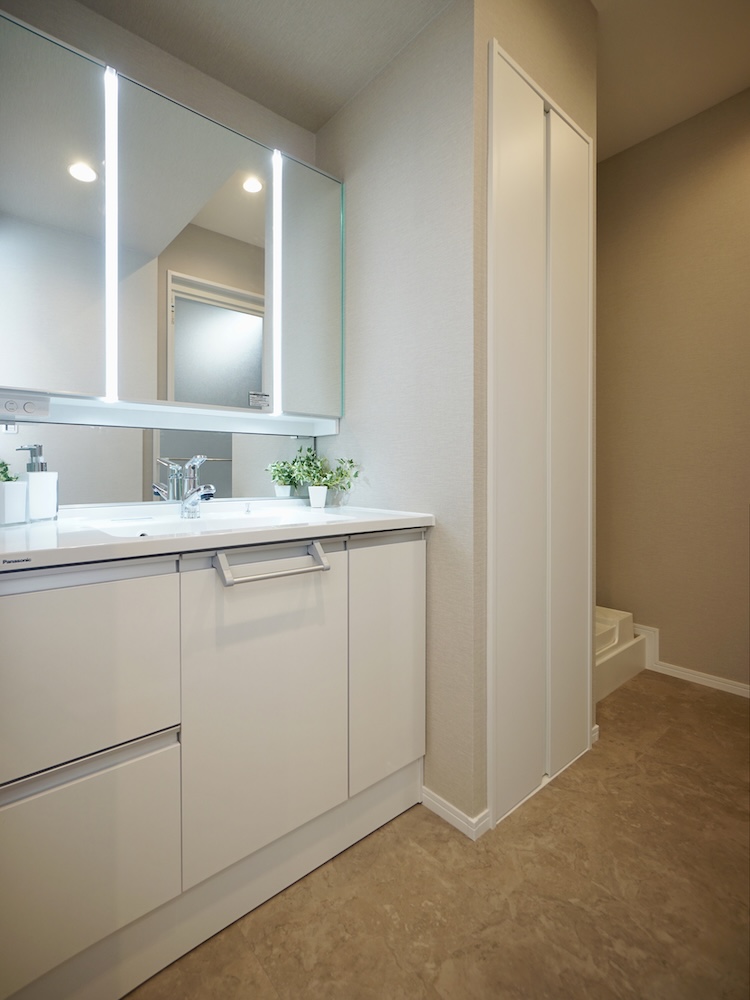 顔全体を美しく映すツインライン照明に、タオルも収納できる大きなキャビネットが備わります。