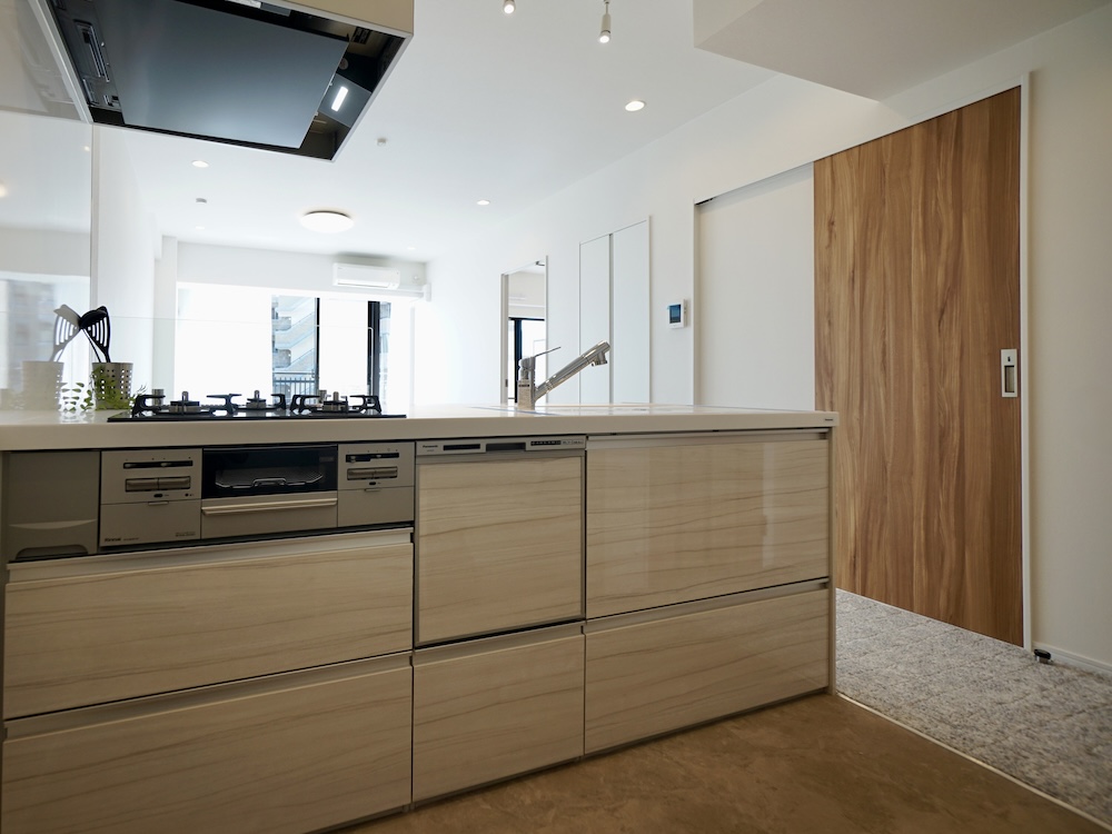 光沢ある木目が美しいシステムキッチンには、食洗器や人造大理石のカウンタートップなど、快適な調理をサポートする最新の設備が備わっています。