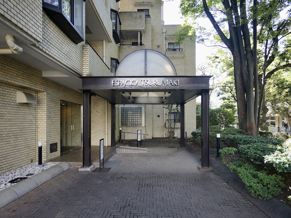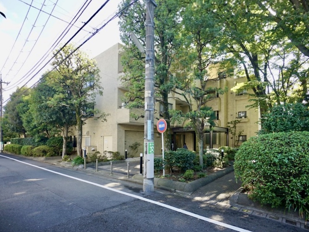 ベージュのタイルを豊かな緑が覆う、5階建ての低層マンションがあらわれます。