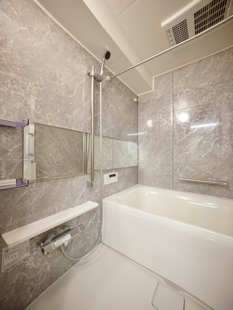 大理石調のパネルがラグジュアリーな雰囲気で、アロマキャンドルやバスソルトで、贅沢な時間を過ごしたくなるインテリアです。