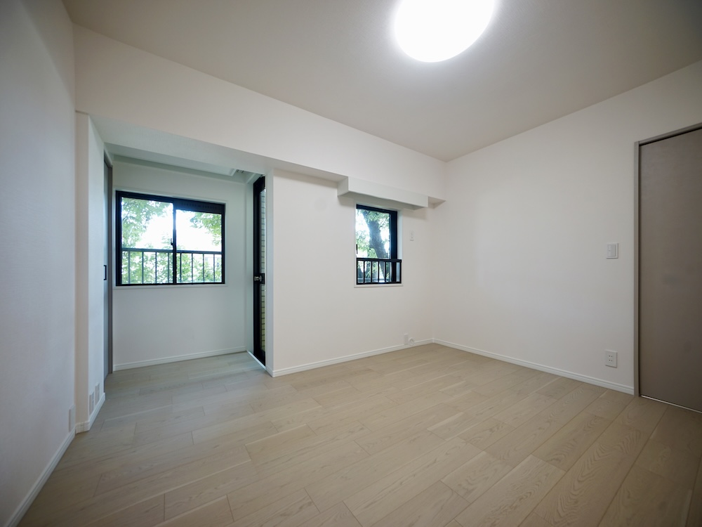二面開口ならではの開放感に、窓外に覗く緑が癒やしの雰囲気を加え、気持ちの良さそうな空間が完成しています。