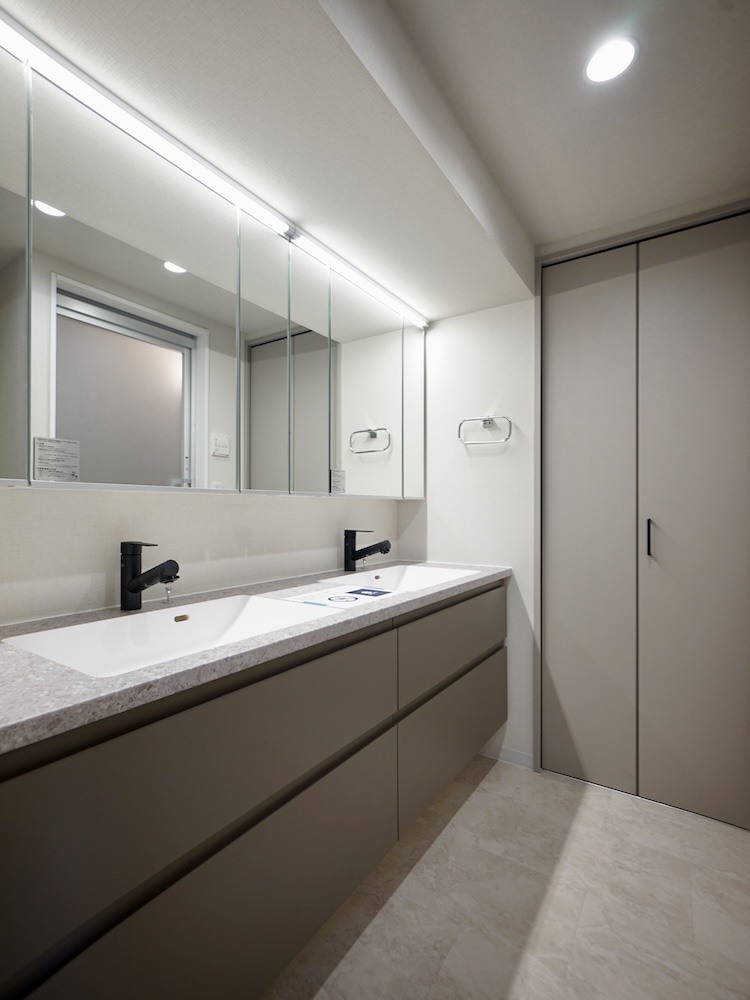 ダブルボウルの洗面台は特別感があり、忙しい朝でも家族がそれぞれのペースで身支度できるのがメリットです。