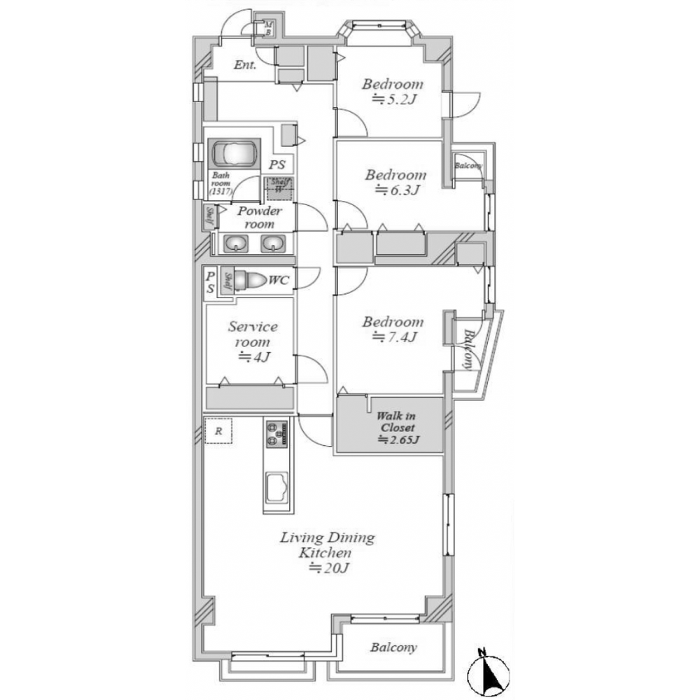 7.4畳の個室は十分な広さが確保され、大きなウォークインクローゼットにバルコニーも備わり、主寝室として申し分のない条件が揃っています。