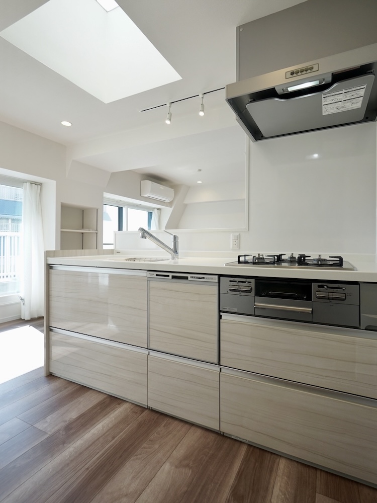 南面の大きな窓に加えて、トップライトからもやわらかな光が注ぎ、明るさと開放感に包まれながら、気持ちよく料理ができるスペースです。